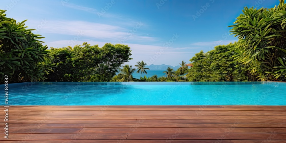 Obraz na płótnie Canvas - Wooden floor on swimming pool backdrop. Luxurious vacation at beachfront resort.