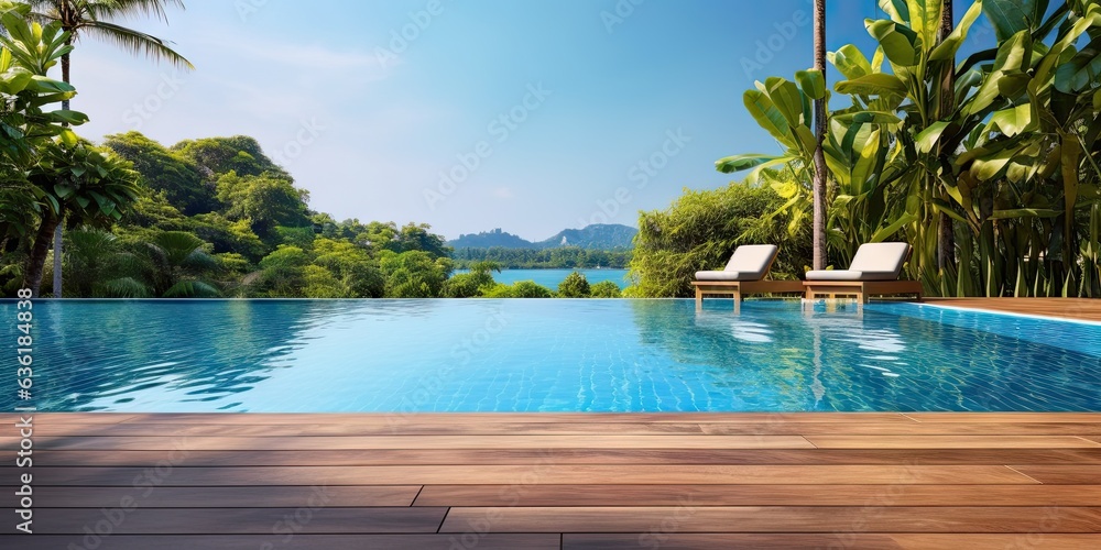 Obraz na płótnie Canvas - Wooden floor on swimming pool backdrop. Luxurious vacation at beachfront resort.