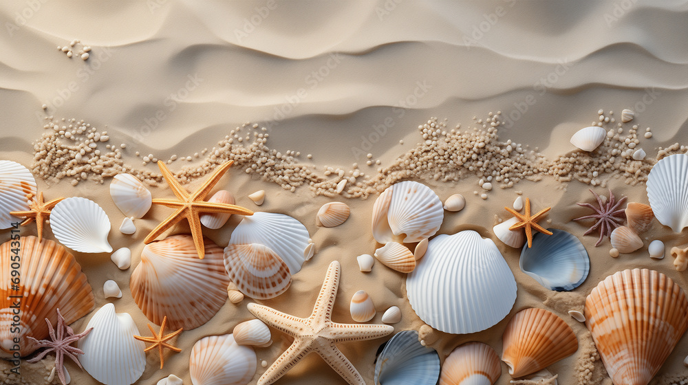 Obraz na płótnie Canvas - Seabed with different seashells and sea stars, top view.