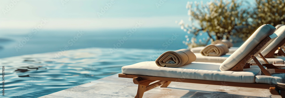 Obraz na płótnie Canvas - Sunbeds with towels by the pool with sea views..