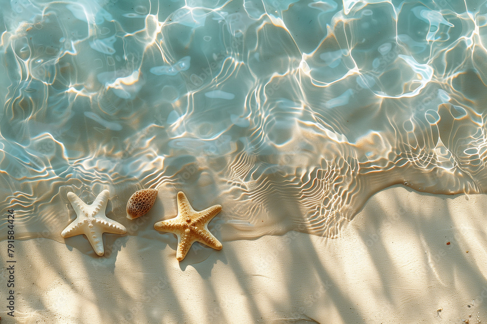 Obraz na płótnie Canvas - Sun lights shadow in wavy water on abstract sand background, beautiful abstract spa concept banner of sea paradise island, top view.