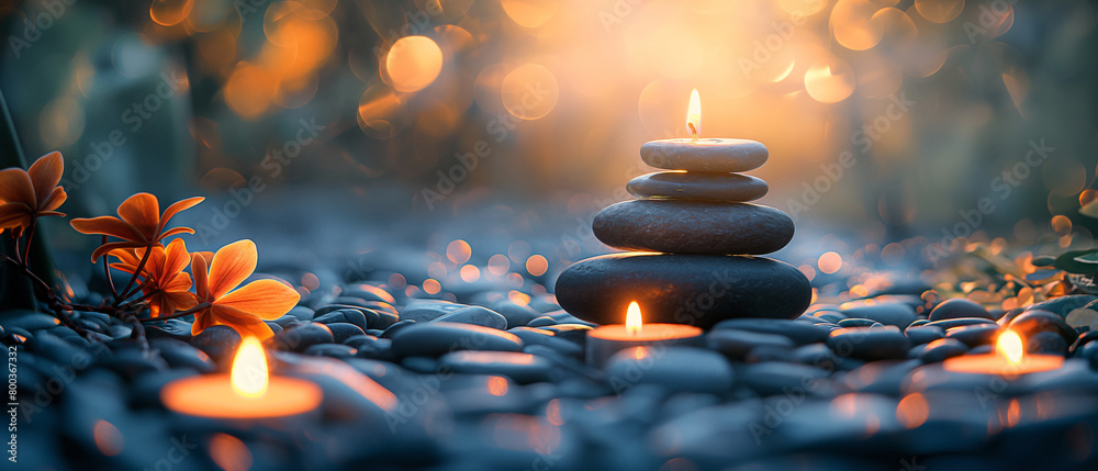 Obraz na płótnie Canvas - banner , spa, meditation,health,onsen,A stack of zen stones with candle on the table in the garden over the sea of cloud.