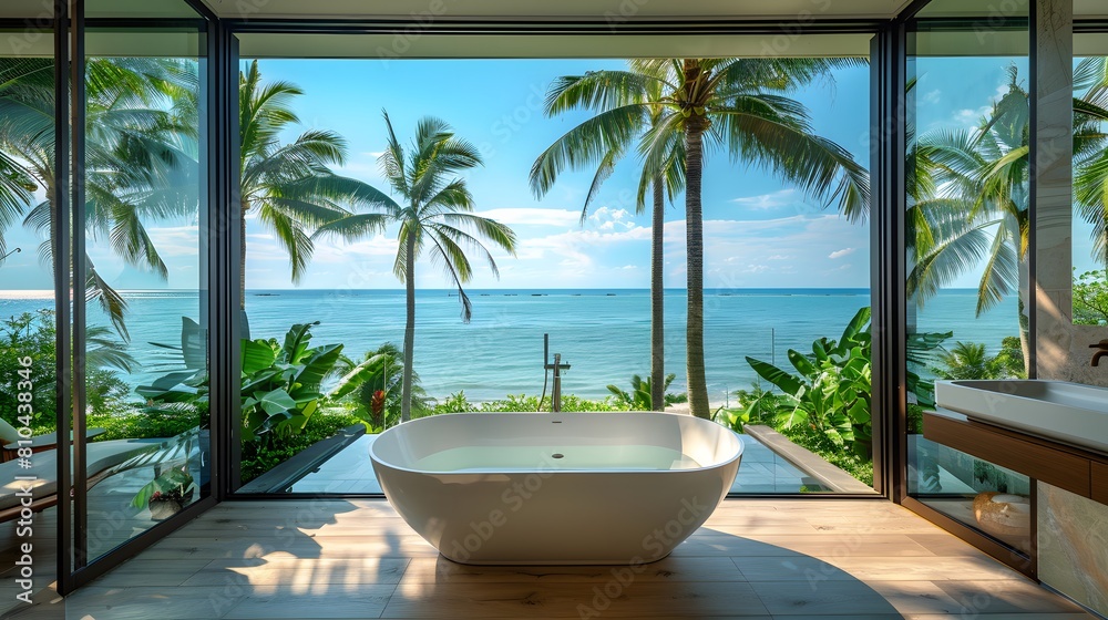 Obraz na płótnie Canvas - A large bathroom with an elegant bathtub overlooking the sea and palm trees, featuring panoramic windows that open to outdoor views of lush greenery and azure waters. .