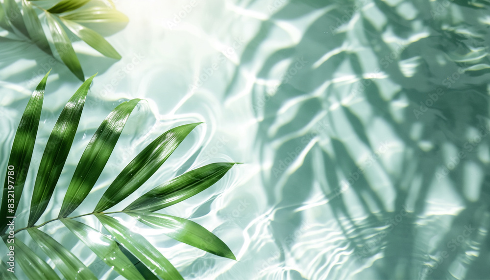 Obraz na płótnie Canvas - blue water texture blue mint water surface with rings and ripples spa concept background flat lay copy space, top view of a palm leaf on the water, summer background for a product presentation banner .
