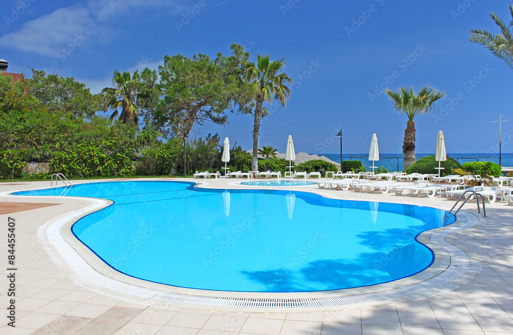 Obraz na płótnie Canvas - Swimming pool area near Mediterranean Sea in Antalya, Turkey.