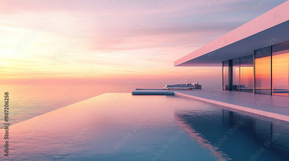 Obraz na płótnie Canvas - modern architecture, house with infinity pool and sea view at sunset.