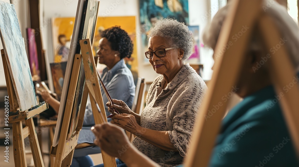 Obraz na płótnie Canvas - A diverse group of older adults painting on easels in an art class.