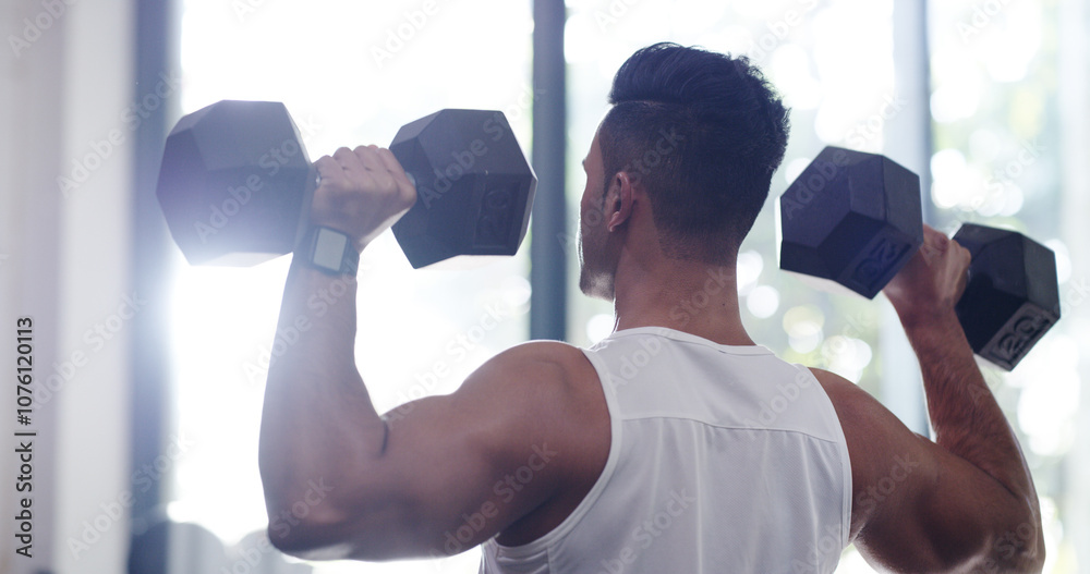 Obraz na płótnie Canvas - Fitness, man and weights with exercise in gym for strong muscles, biceps growth or workout performance. Athlete back, bodybuilder and weightlifting at sports center for endurance training or wellness.