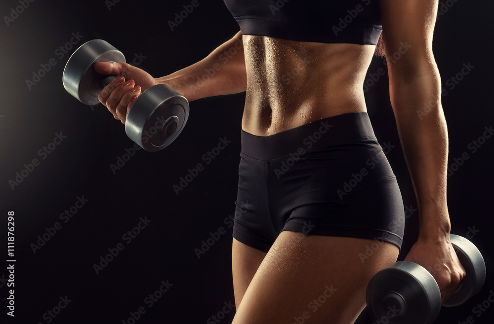 >Obrazy na płótnie Canvas>Beautiful fitness woman lifting dumbbells . Fitness sporty woman showing her well trained body . A beautiful girl's body with rippling muscles from strength training .