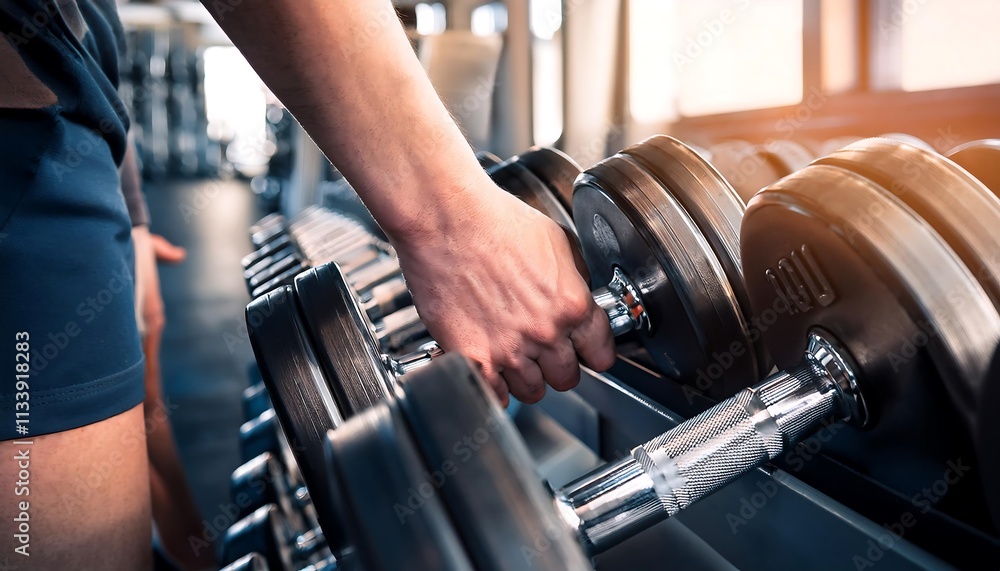 Obraz na płótnie Canvas - Hand selecting a dumbbell from a rack in a gym, focus on fitness and strength..