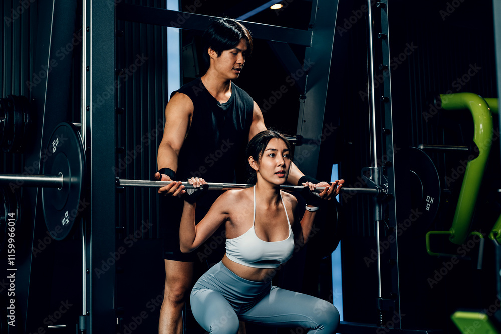 >Obrazy na płótnie Canvas>Asian woman guy a squat exercise legs heavy weights with a barbell with the assistance of a trainer in gym interior, Man doing training lifting barbell to female at fitness gym center, sport workout