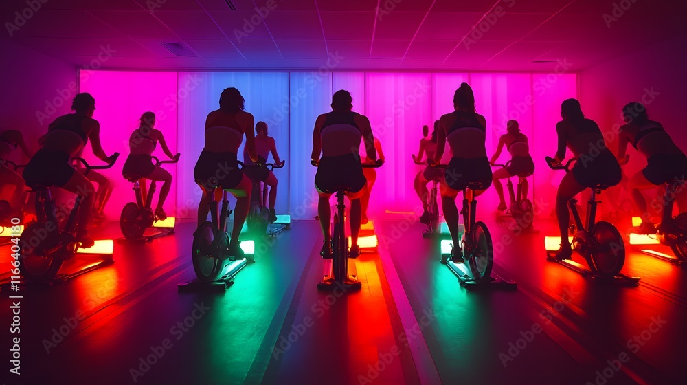 Obraz na płótnie Canvas - Silhouetted figures of women intensely cycling in a vibrant, neon-lit spin class. Energetic fitness atmosphere..
