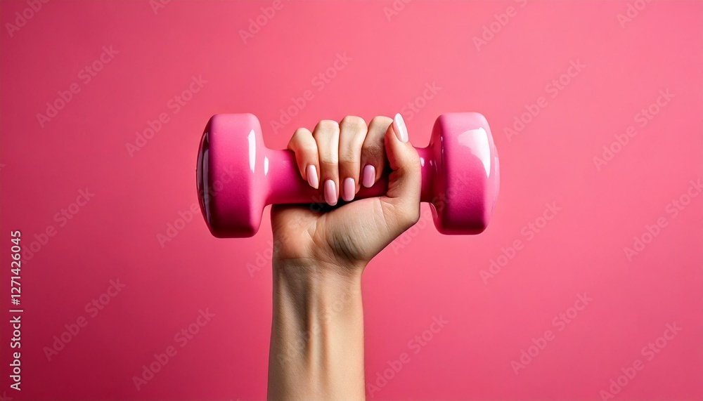 >Obrazy na płótnie Canvas>A closeup view of the hand of a young lady holding a pink color dumbbell with a pink color background; sports photography; fitness and exercise