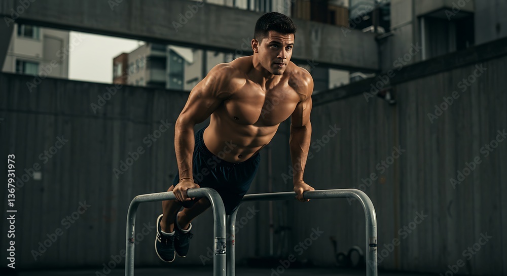 Obraz na płótnie Canvas - Muscular Man Doing Dips Exercise on Parallel Bars Outdoors During Daytime.