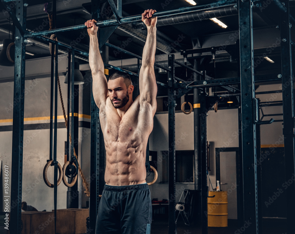 Obraz na płótnie Canvas - A man doing ABS workouts on pull up bar in a gym club..