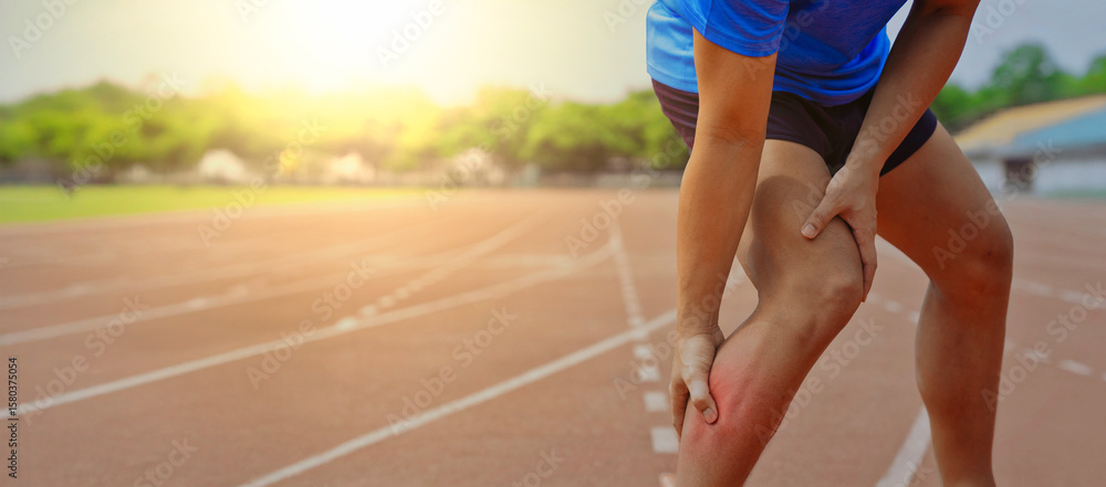 >Obrazy na płótnie Canvas>Athlete holding painful red sore calf on running track showing muscle cramp or leg injury during sports training exercise outdoors