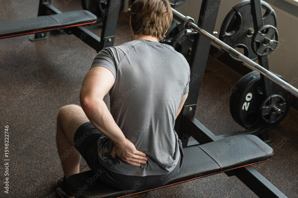 >Obrazy na płótnie Canvas>Athlete or young man sitting with pain in lower back at gym with muscle tension. Arm, inflammation or exercise with discomfort at fitness center. Close up.
