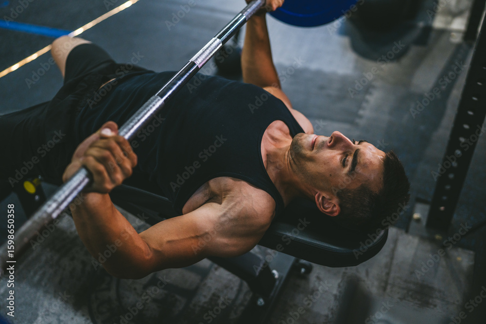 Obraz na płótnie Canvas - Handsome young athlete man doing bench press workout in gym.