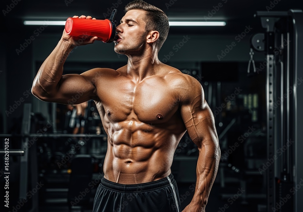 Obraz na płótnie Canvas - Muscular man with ripped abs drinks from red shaker bottle after intense gym workout session.