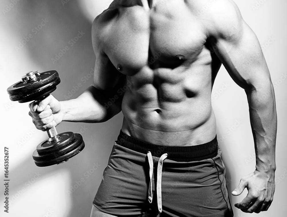 Obraz na płótnie Canvas - Shirtless fit bodybuilder horse lifting dumbbell showing muscles and six-pack after workout.