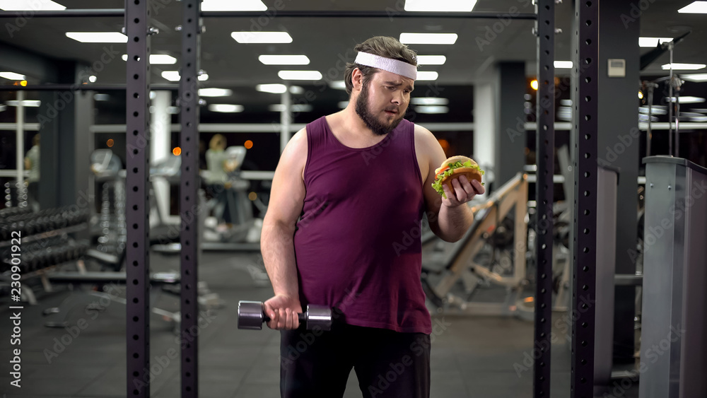 Obraz na płótnie Canvas - Overweight man holding burger and dumbbell in hands, life decision, motivation.
