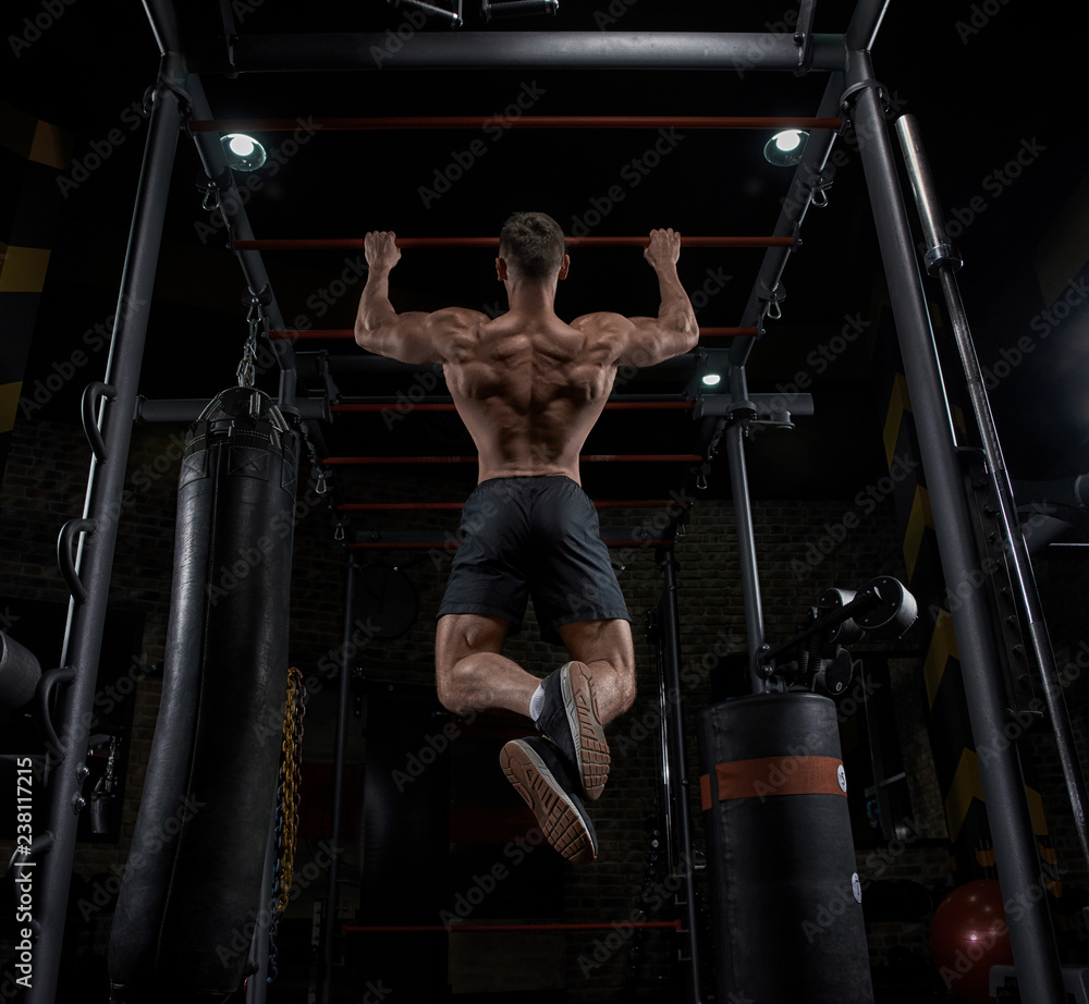 Obraz na płótnie Canvas - Muscular man working out in gym doing exercises, strong male naked torso abs..