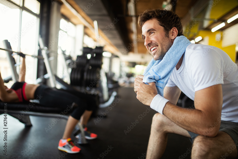 Obraz na płótnie Canvas - Lifestyle portrait of handsome muscular man after the training in the sport gym.
