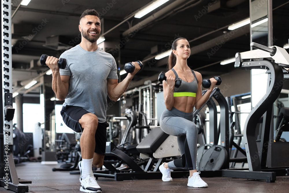 Obraz na płótnie Canvas - Attractive sports people are working out with dumbbells at gym..