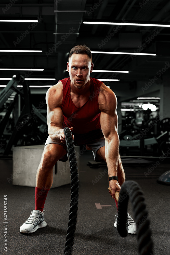 Obraz na płótnie Canvas - Sport. Strong man exercising with battle ropes at the gym with. Athlete doing battle rope workout at gym. Dramatic sports background..