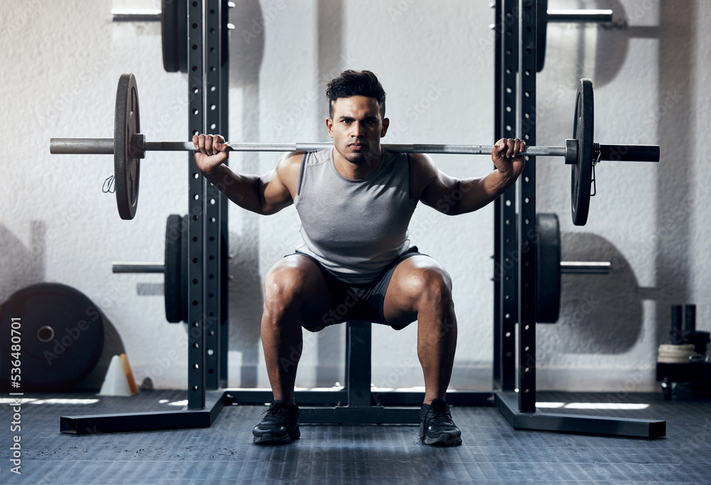 >Obrazy na płótnie Canvas>Weightlifting, gym and man strong in exercise, workout and training body. Fitness, muscle and motivation for health, wellness and sport in portrait of focus, determination and power for bodybuilder