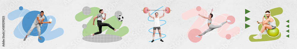 Obraz na płótnie Canvas - Panorama photo collage cadre of young sportive people fit gym concept muscle biceps strong play baseball football isolated on grey background.