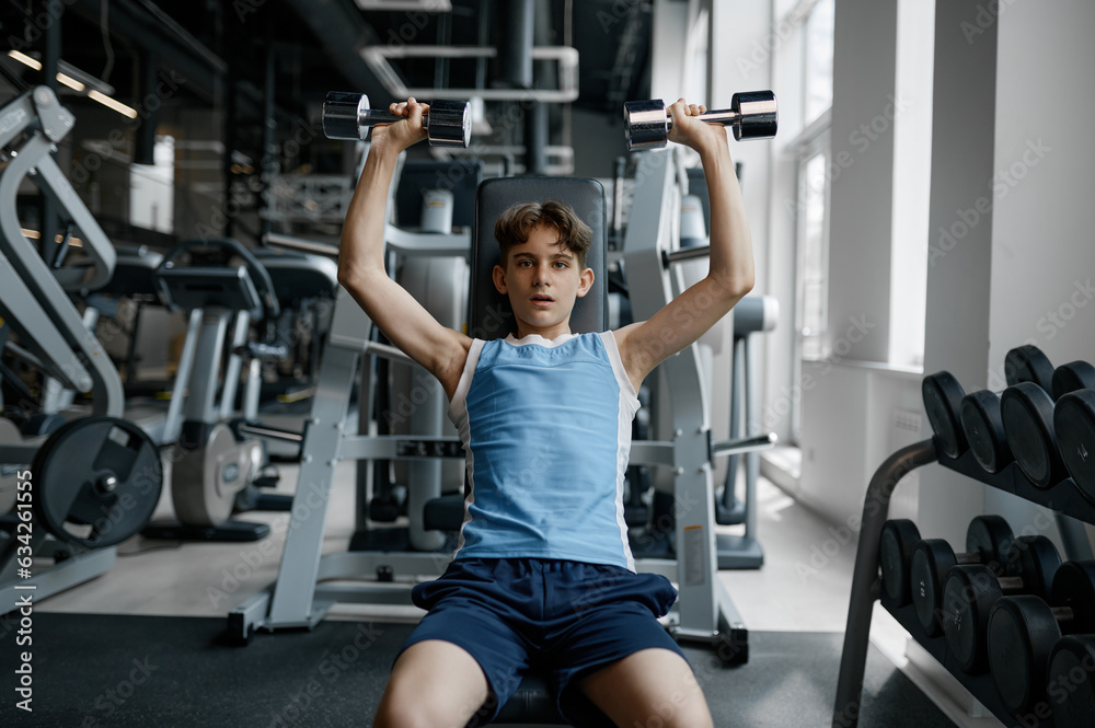 Obraz na płótnie Canvas - Serious strong teenager boy training with dumbbells while sitting on bench.