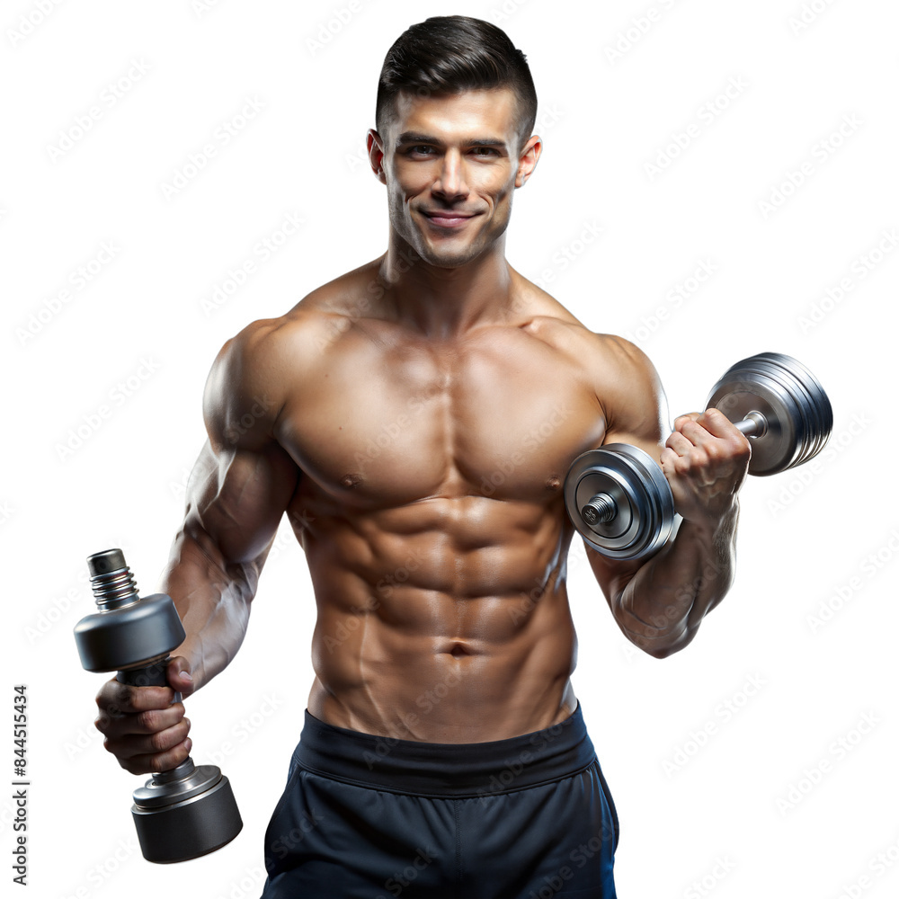 Obraz na płótnie Canvas - Muscular man lifting dumbbells on transparent background.