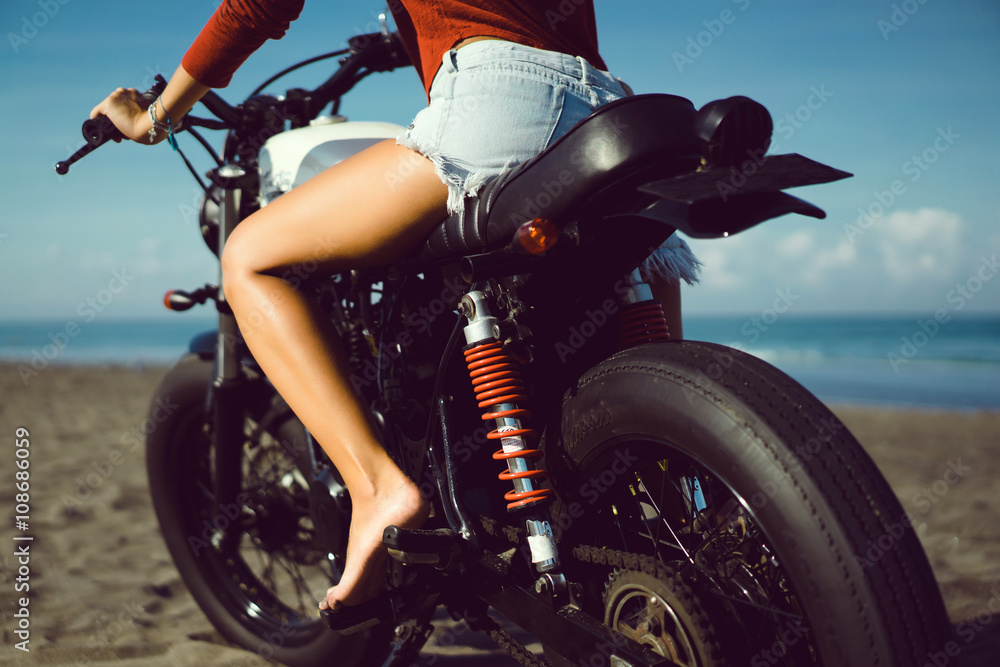 Obraz na płótnie Canvas - young pretty hipster girl Biker girl sitting on vintage custom motorcycle Biker girl sitting Outdoor lifestyle portrait. jeans short denim, fashion style.
