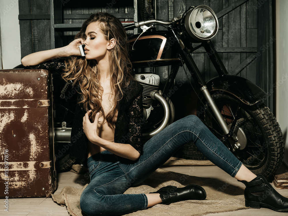 Obraz na płótnie Canvas - sexy girl biker with suitcase at motorcycle hold mobile phone.
