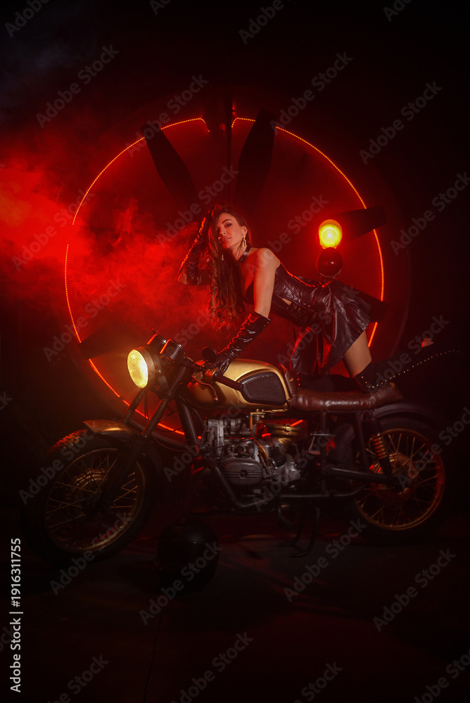 >Obrazy na płótnie Canvas>Stylish beautiful young woman in black leather corset and boots posing on vintage motorcycle on old garage dark interior background.