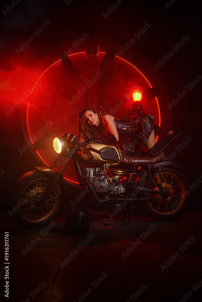 Obraz na płótnie Canvas - Stylish beautiful young woman in black leather corset and boots posing on vintage motorcycle on old garage dark interior background..