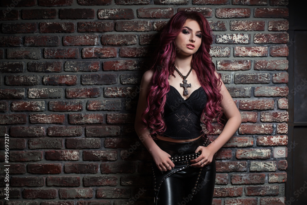 Obraz na płótnie Canvas - redhead adult girl biker in the leather wear indoor.
