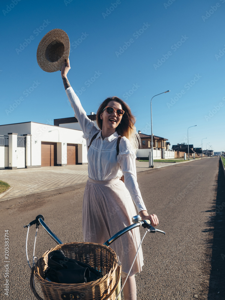 Obraz na płótnie Canvas - Pretty girl in hat and dress by cruiser bicycle in suburb.