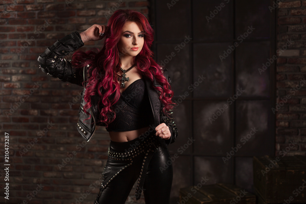 Obraz na płótnie Canvas - redhead adult girl biker in the leather wear indoor.