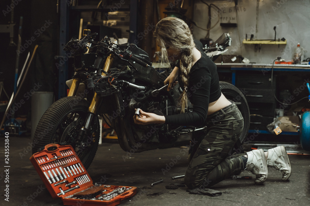 Obraz na płótnie Canvas - beautiful girl with long hair in the garage repairing a motorcycle.