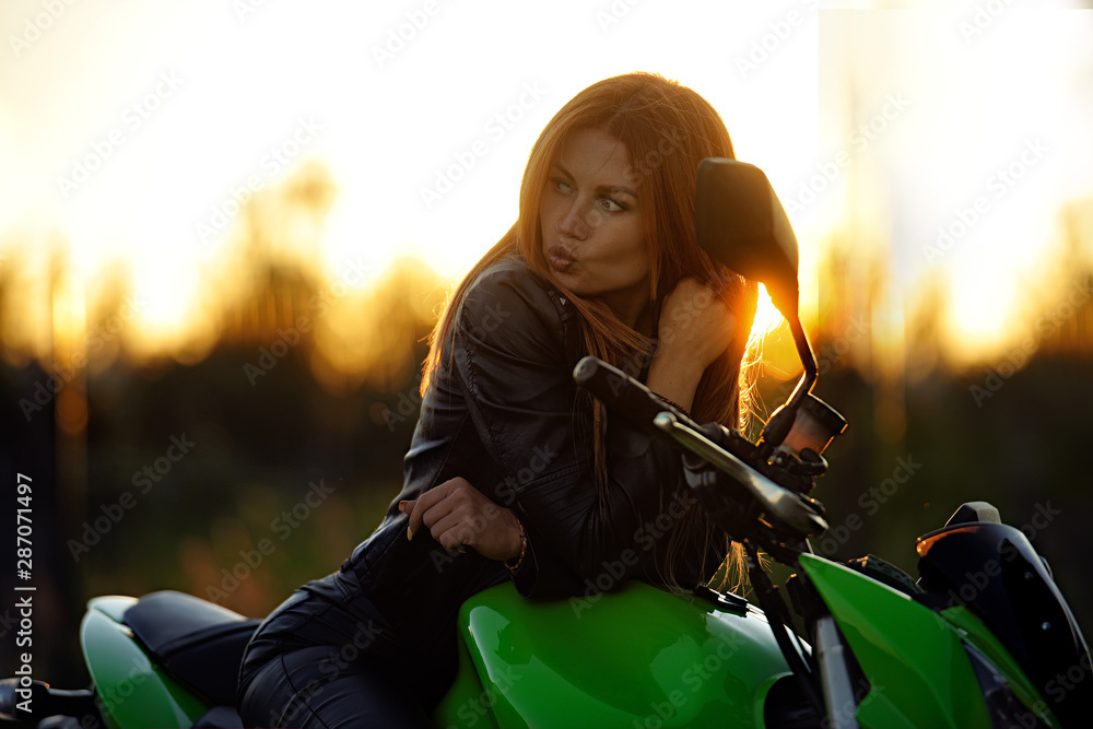 Obraz na płótnie Canvas - Beautiful young girl with a fashionable hairstyle and red lips poses next to motorcycle.