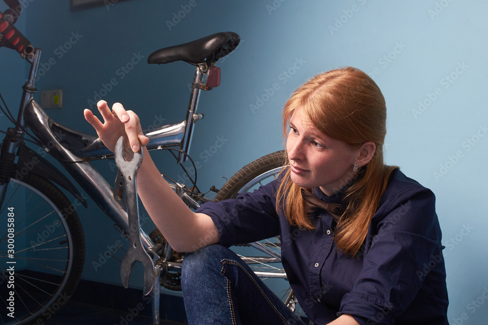 Obraz na płótnie Canvas - girl repairs the bike.pretty girl sitting on the floor of a bike shop and does not know what to do with the tool.
