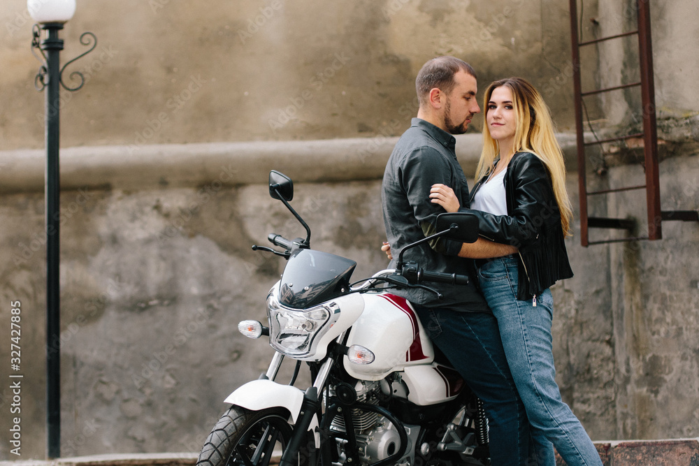 Obraz na płótnie Canvas - Couple on motorbike near old building.