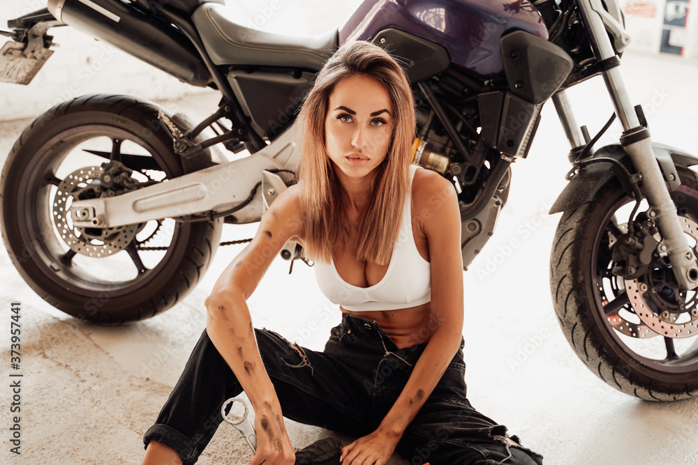 Obraz na płótnie Canvas - An attractive girl in dirt sirring near sport moto bike.