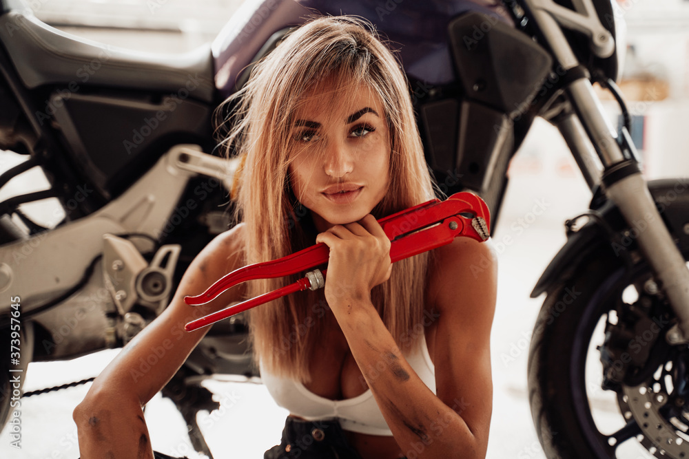 Obraz na płótnie Canvas - Sexual girl is sitting in the bright room with bike behind.