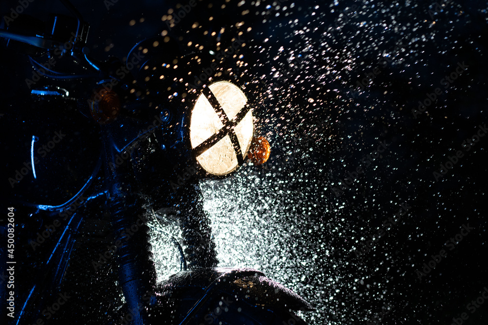 Obraz na płótnie Canvas - Vintage styled scrambler motorcycle on washing. Splashing water on headlights. Blue illumination at night. Classic black motorbike. Caferacers style. Maintenance of motor vehicles.