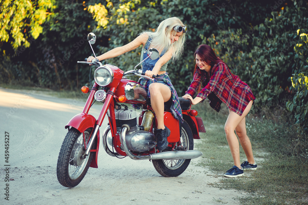>Obrazy na płótnie Canvas>Young beautiful women ride a retro motorcycle. A talented girl in a blue overalls. They push the motorcycle, the merry go to the road. sale of spare parts. Place for text