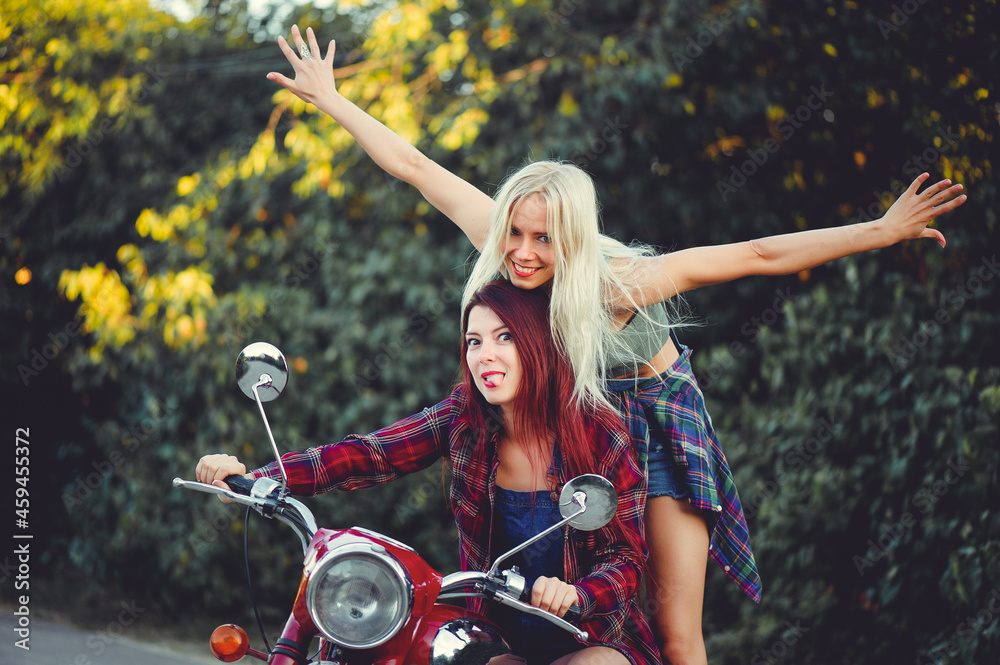 >Obrazy na płótnie Canvas>Young beautiful women ride a retro motorcycle. A talented girl in a blue overalls. They push the motorcycle, the merry go to the road. sale of spare parts. Place for text