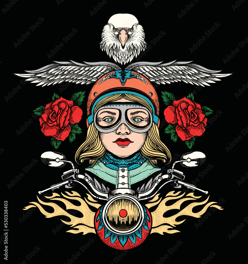 Obraz na płótnie Canvas - motorcycle girl. Illustration design surrounded by eagle, wings and roses. .